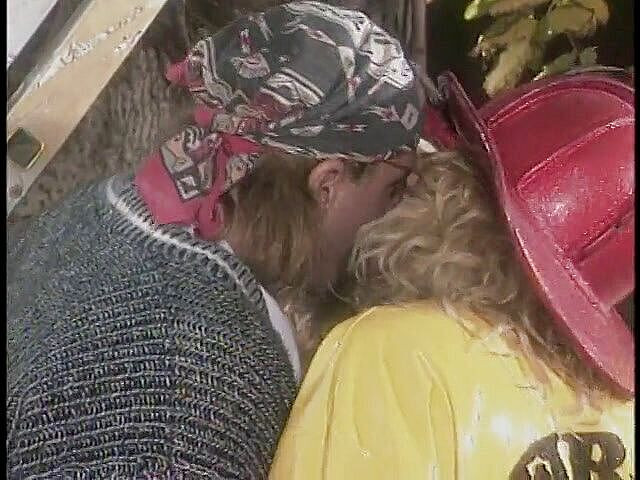 Blonde firefighters with big tits get fucked by an old hippy in field