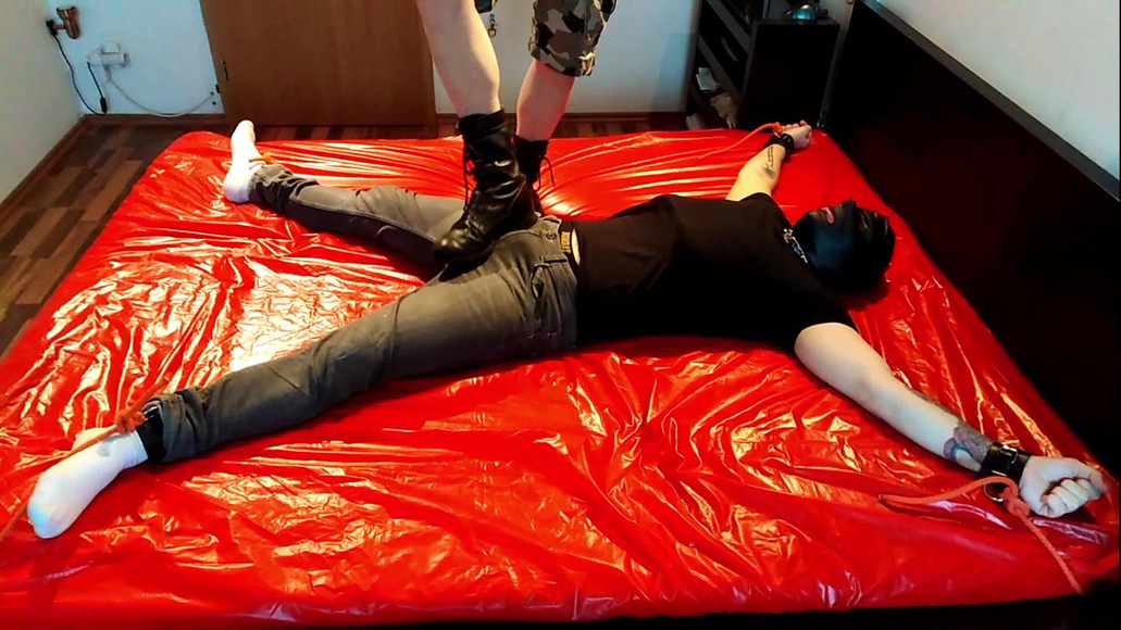 I tied my slave Igy to the bed by his hands and feet. Then I cut his clothes and......
