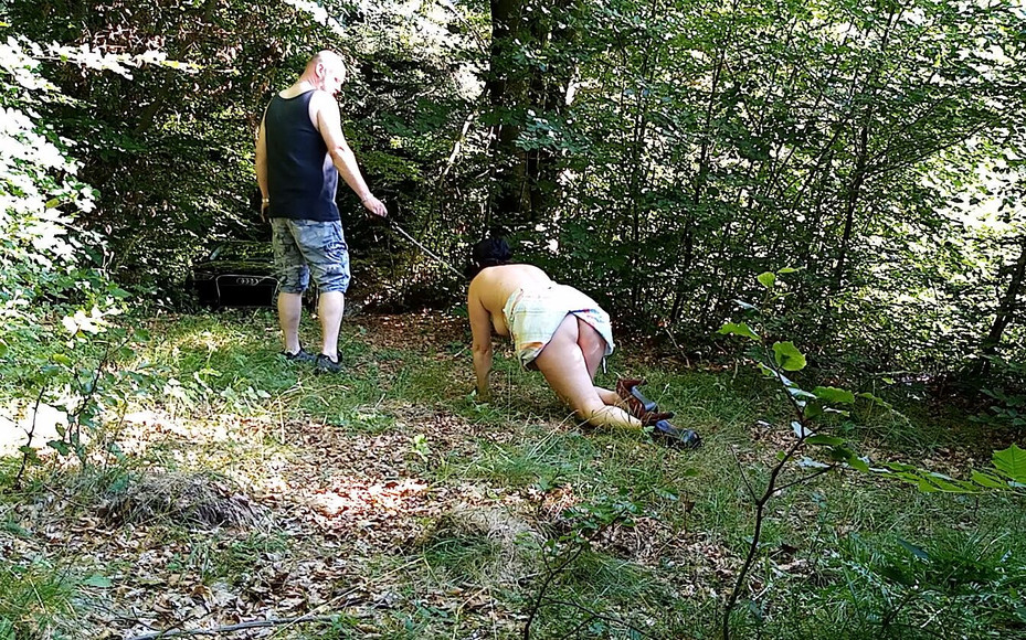 Milf submissive wife takes to forest walk on a leash. Trained with a dildo and deep throat. Her dirty mouth was washed with urine. As a reward, because the training was good, he can eat sperm. Guys, always train your wives to be better!