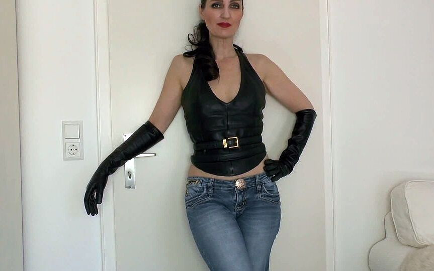Today you see me in blue jeans with a long belt that is worn twice. Today I combine leather and jeans. I'm wearing a sexy leather top. I wear blue tight jeans on my legs. You see beautiful posing and close-ups. I put on long leather gloves. Leather and jeans are a fantastic combination! I open the belt and show you how long the belt is. Then I put the belt back on, you can see it in close-ups. I turn and you can admire the outfit from all sides.