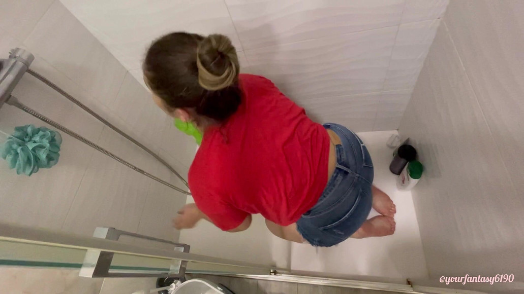 I am cleaning the shower in my short jeans. I am very gassy. While I am rubbing the tiles I let out big noisy farts. My jeans are getting wet and the farts start to sound wet.