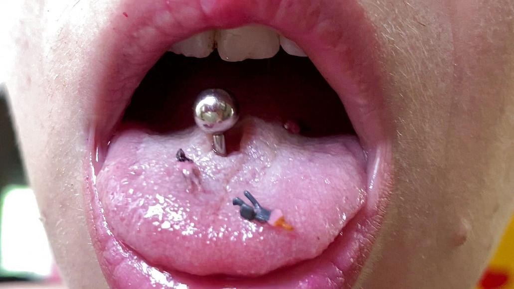 Extreme close up video with model train people 1:300 scale on my tongue