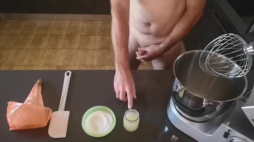 Cicci77 masturbates Pedro to collect the last grams of sperm and reach the goal of 135 grams. Then after milking Pedro prepares a super batch of meringues for his fans. The sperm will gradually turn into excellent sperm meringues
