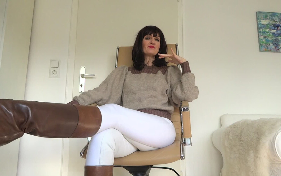 Today I'm wearing tight white breeches and a great knitted sweater. Matching tall leather boots. I show you my sweater and come closer. You can sniff my sweater and touch it. You can rub your cock on my sweater until you have to cum!
