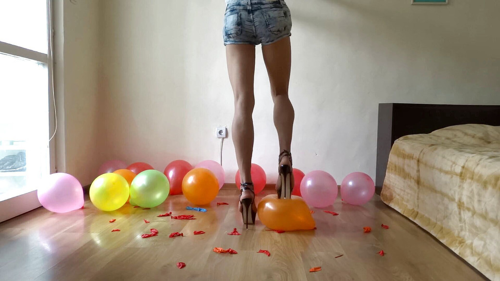 I am using my sexy 7 inch black sandals to smash these poor balloons to the ground. Only one move and I am destroying them immediately with my sharp heel. Enjoy!