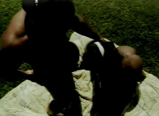 Busty ebony slut blows black cock and gets fucked outdoors before takes a big dose of a load in her mouth.