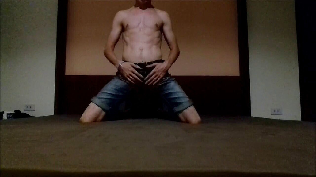 Hot Russian guy from the village fingering his big dick in denim shorts on the bed