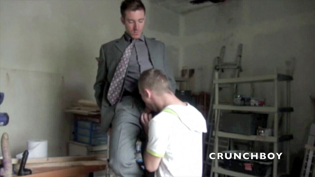 Sexy blonďatá twink ošukaná kommericial v obleku, která prodává sexuální hračku