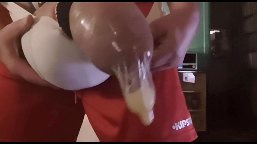 Honění s naplněným kondomem se 4 náklady uvnitř