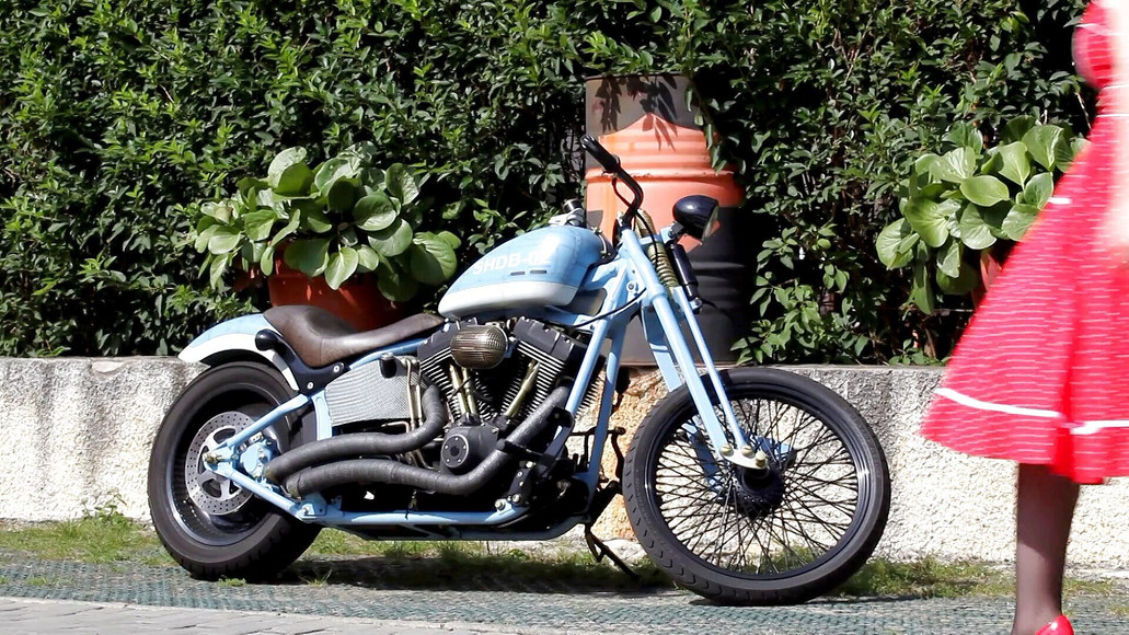 Sexy prsatá blonďatá milfka v úžasných šatech při sólové akci na kole