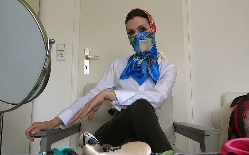 Today I'm trying on the 5 new satin scarves worn as a cloth mask with a headscarf. In the first styling, I tie the headscarf and sheet mask at the back. Then I change the styling. I put on the headscarf first, tied at the back. Then I put on the sheet mask, tied at the front. How do you like my styling? I try on different satin towels.