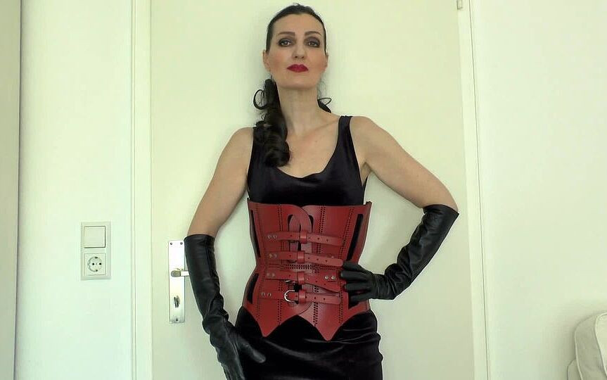 Today I would like to introduce you to a special leather belt. The wide leather belt is reminiscent of a corset and is closed at the front with buckles. I'll show you beautiful posings and close-ups. I wear 3 pairs of gloves with the wide corset belt. First the short red leather gloves. Then the long red and finally the long black leather gloves. Which gloves do you like with the red corset belt?