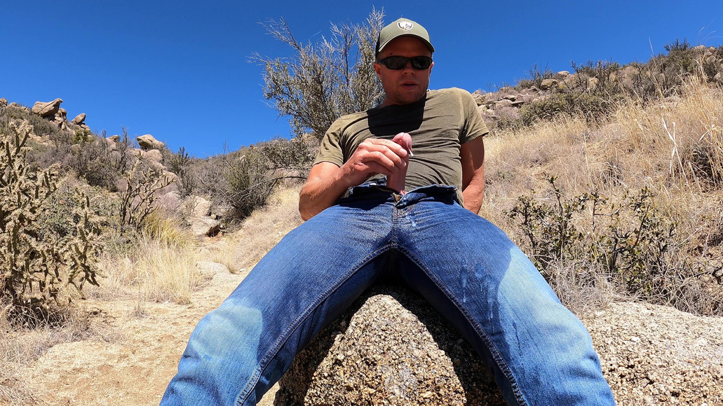 Hiking in the mountains on the first day of April, I spray piss all over myself and blow a huge load of cum all over my soaked jeans.