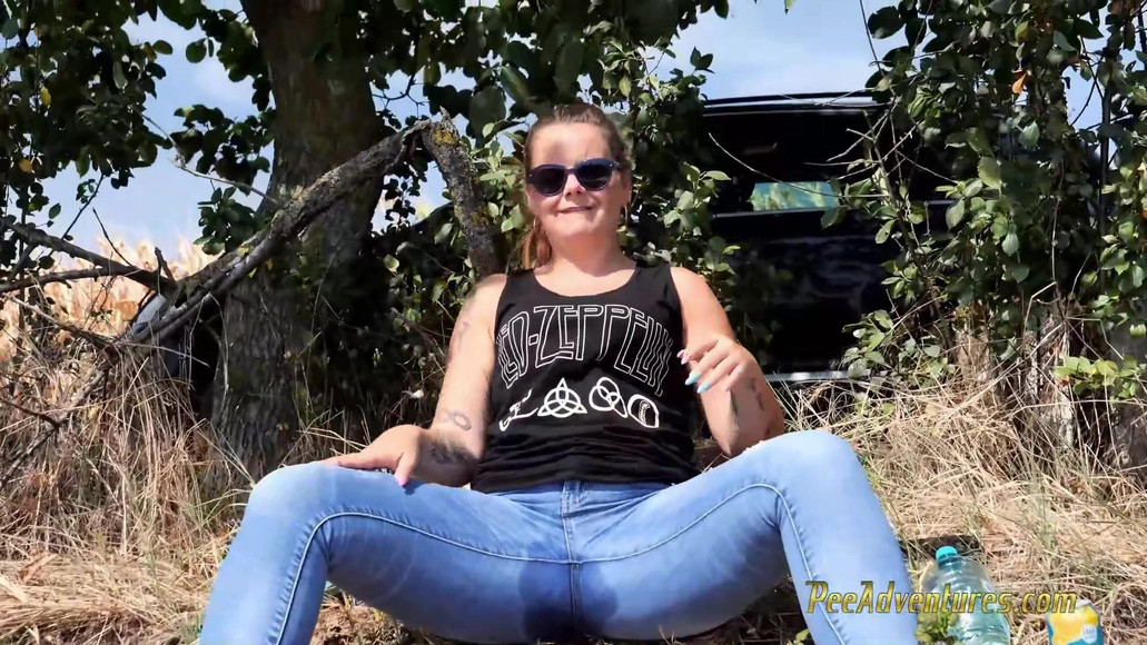 Sexy girl smokes and changes her clothes outdoor, in the car. Then she puts on a white skirt and empty her bladder in front of a house in construction. She had so much pee in her that she wet her panties completely. She then strips and waits there so the wind can dry her pussy and her wet panties. This day is so hot that she had a lot of lemon juice. Then she has to sit down to take a call from er boyfriend. While she is speaking with him she feels the tickling sensation and she cannot help herself. She pee in her jeans while talking with him.