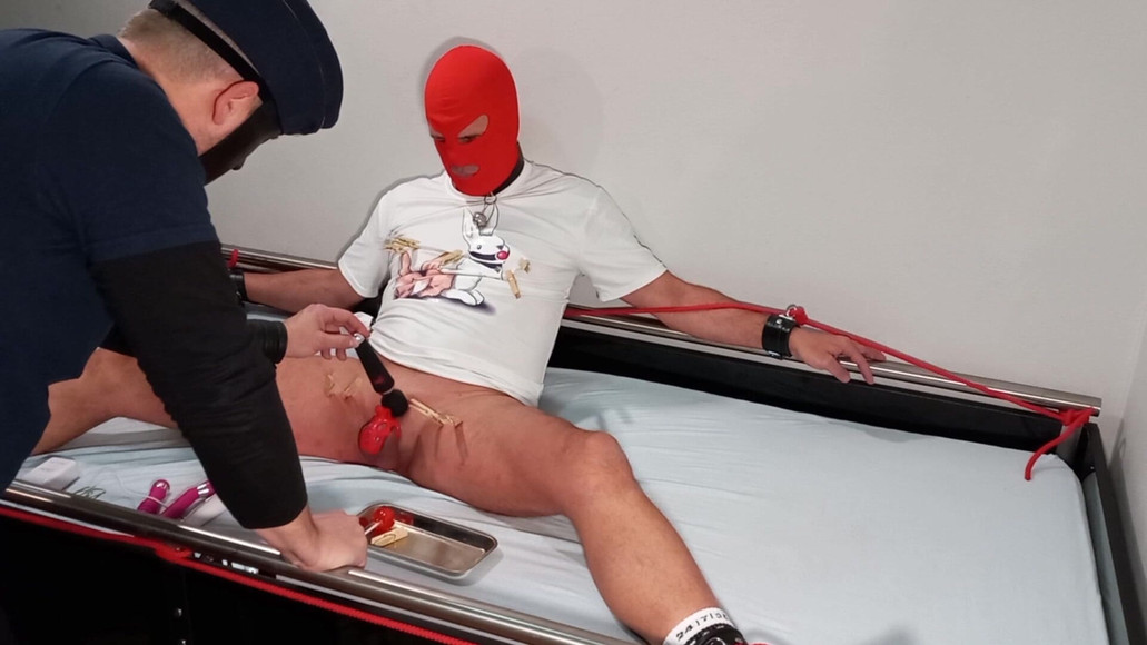 Locked slave teased with pegs and vibrating toys... Till the happy end.