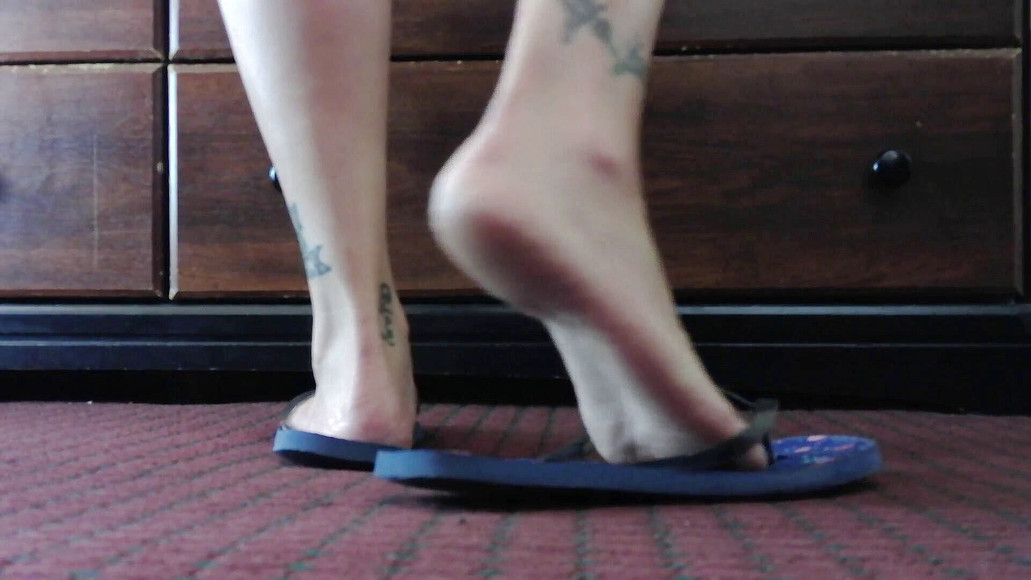 I am busy, with no time for a show. I have a voguer view of my flip-flops and bare feet nice close-up. I am doing my makeup above focused and my feet have random reactions to dipping, sliding playing in my dark blue flips flops. Resulting in toe pointing arches bare feet toe curls.