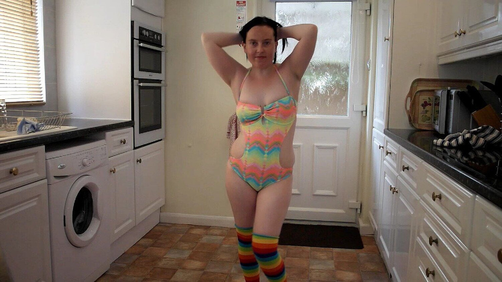 Haley as a brunette in sexy Knee Hight striped Socks and swimwear dancing doing a striptease.
