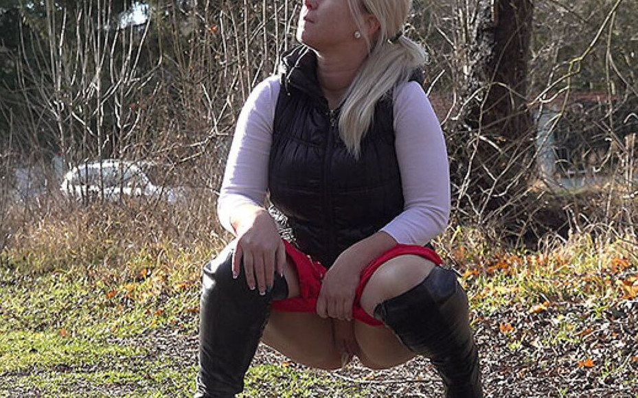 Got2Pee presents "Slowly On The Cycle Path" - part of the Puffy Network. Sexy blonde Licky Lex walks along a cycle track in tiny red hotpants and knee high boots. She looks around to see if anyone is looking before squatting to pee and enjoys a piss while her juices flow down onto the ground. We zoom in close on her shaved pussy and this blonde takes her time to empty her bladder! The first of many hot outdoor pissing scenes this week on Got2Pee!