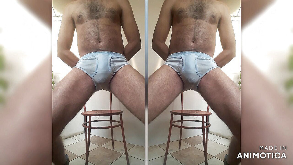 Blue vintage underwear, pissing on it and wearing gloves and construction worker boots, I love to piss on myself .