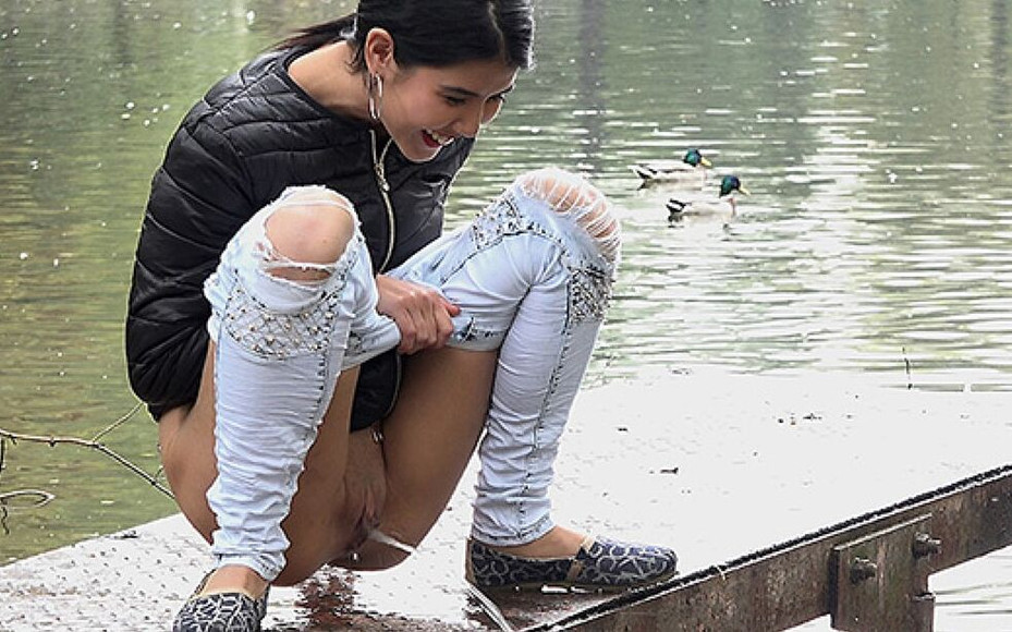 Got2Pee presents "Off The Jetty" - part of the Puffy Network. Exotic looking hottie in denims is desperate to piss. She pulls down her denims and sprays a massive stream of piss onto the grass and we film her on a different day pissing into the river off a jetty while swans and ducks swim past!