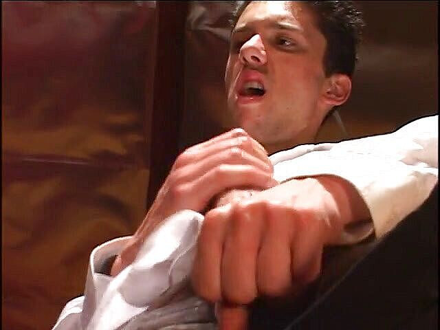 Dude working his shaft with his hand and cumming hard all over the table.