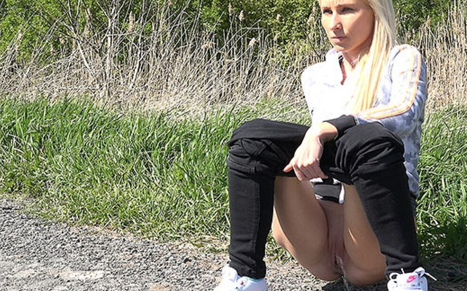 Got2Pee presents "Bright White Pumps" - part of the Puffy Network. A pretty blonde takes a leisurely stroll along a path and decides to partake in some outdoor pissing. She pulls down her black denims and squatting to pee she releasing her juices all over the ground, making quite a nice sized puddle of pee beneath her!