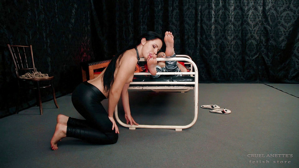 Mistress Anette is feeling playful today and as Kittina walks into the room, she puts both her feet between the rails of the end of the bed and wiggles her toes for her. Mistress Kittina gets the signal and she kneels down at her feet with a nasty smile on her face, just before she licks her sole with her eager tongue.