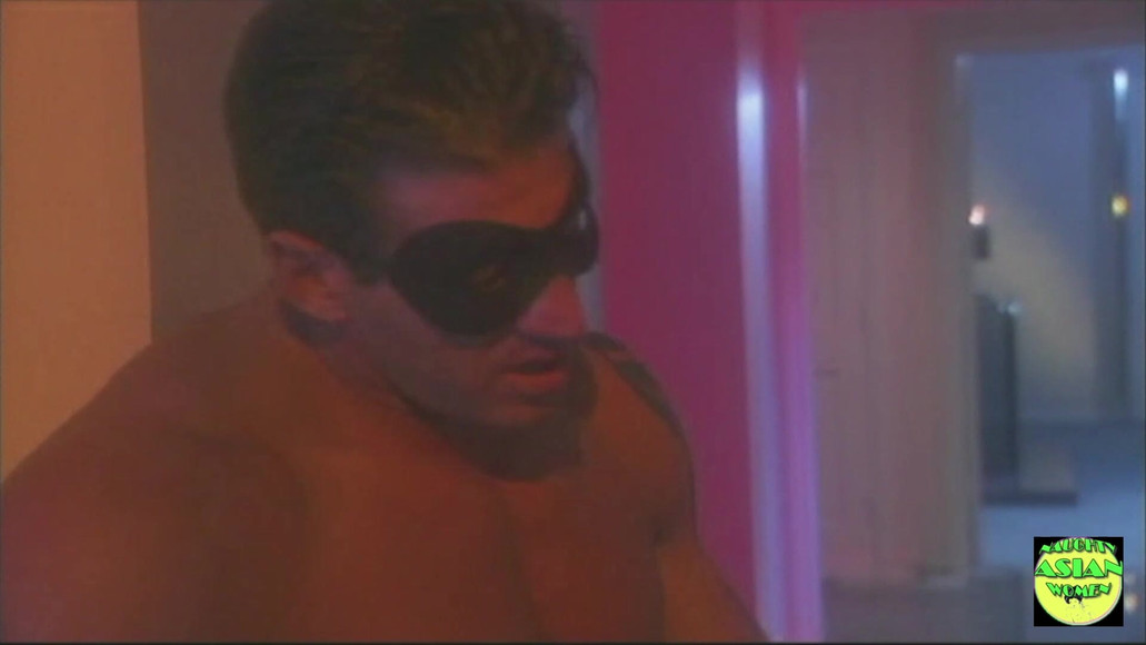 Women wearing masks engage in a very passionate threesome encounter with a well-endowed male partner.
