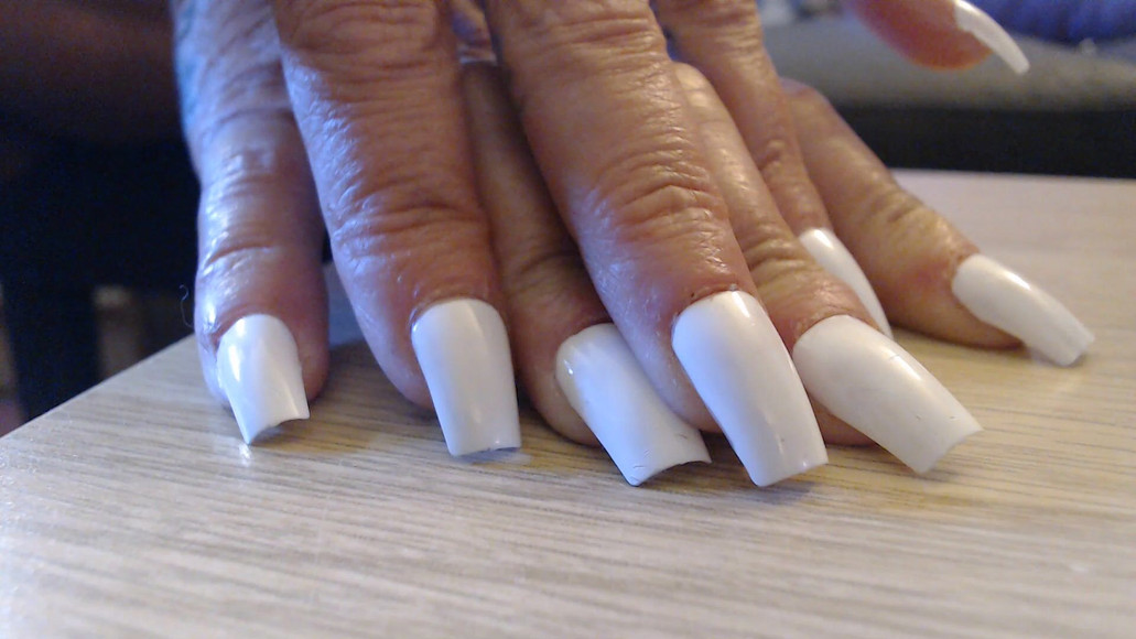 White square tip fake fingernails. Clicking tapping wooded table and my coffee cup.
