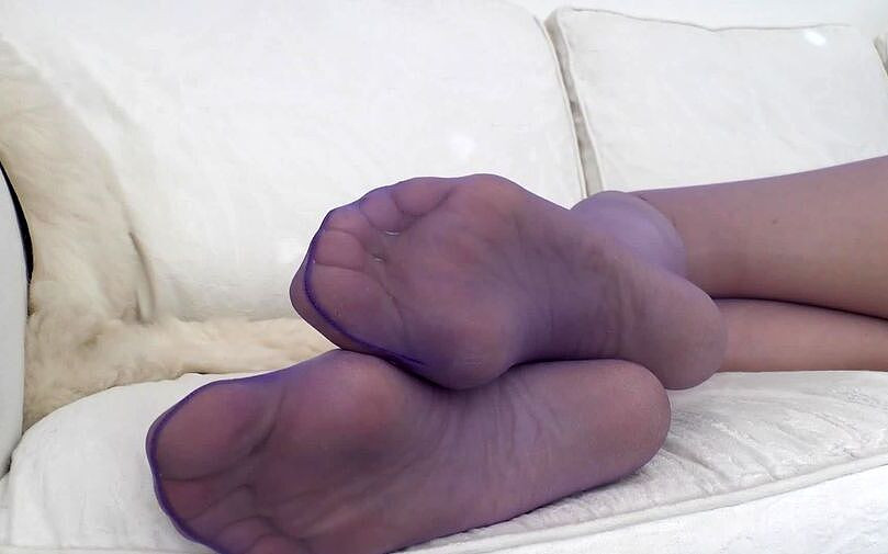 Today I'm wearing exciting shiny purple pantyhose. You see my soles in close-up. I slowly flex my toes. Watch my sexy soles. I turn and you see my feet from above. Now you can admire my red painted toenails. I cross my legs so that you can watch my soles again. For real sole lovers!