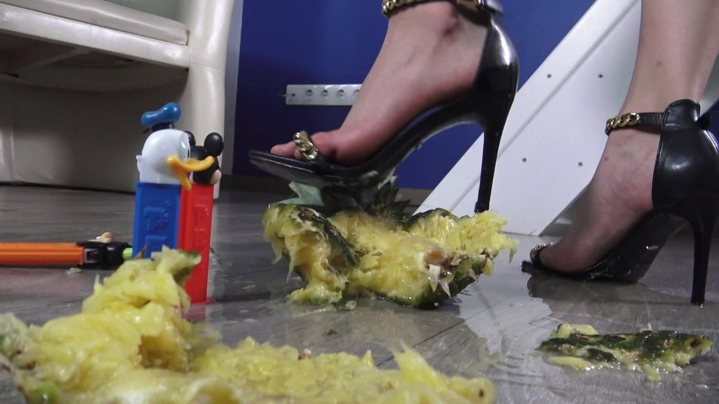 Kitty's stepmother always says with a raised finger, don't play with food. But that doesn't interest the cheeky, provocative. On the contrary, that's why she really enjoys destroying everything. The lascivious girlie has a lot of fun crushing things with her feet. I love the squishy feeling when I crush i Today she had fun piercing a pineapple with her sexy high heels. She crushes the pineapple under her stilettos with sadistic delight. Then she plays with the PEZ figures. She has prepared 3 PEZ figures. Donald, Mickey and Goofy. First they are allowed to feast on the destroyed pineapple. Before they get crushed by the cruel teen dominatrix. She stomps the PEZ figures with her black high heel sandals, leaving nothing but destruction in her wake.