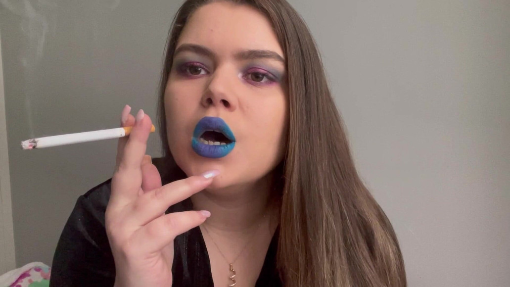 I am smoking 2 cigarettes. I am wearing a mate blue lipstick. I play with the smoke and enjoy every drag. I do some smoke rings, multiple drags and french inhales.