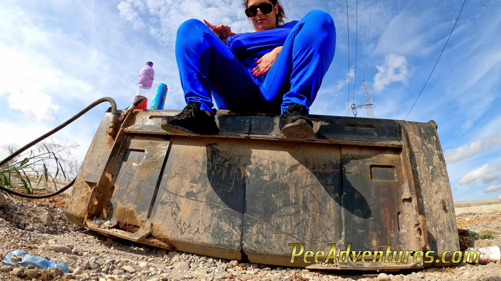 We went for a ride outdoors. She had a lot of juice to quench her thirst. She has a big bladder (being a big girl) but it gets full and she needs to empty it peeing outdoor. We had to pull over because she had so many liquids that she cannot held herself. She climbs on a excavator bucket and she opens her legs and pee trough her pants right there being very scared to be seen by cars and people passing by. Yet she still manages to relive herself on the excavator bucket in a tight pee jet.