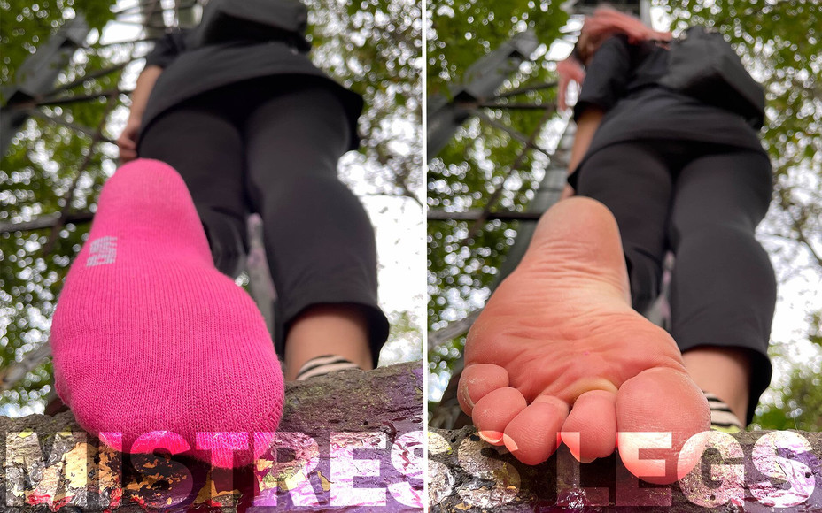 I was walking along the railway in sneakers with cute pink socks and decided to take my socks off cause it is too hot outdoor. I teasing you with my socks before take them off. My feet after walks in flip-flops became a little rough and I haven't had time to scrub my feet yet. So if you love rough natural female feet this video is for you. I standing above you, so you have amazing viewangle from the bottom of my feet. In this video I just take of my socks, tease you with my bare soles and toes, put on my sneakers back and and went for a walk further.