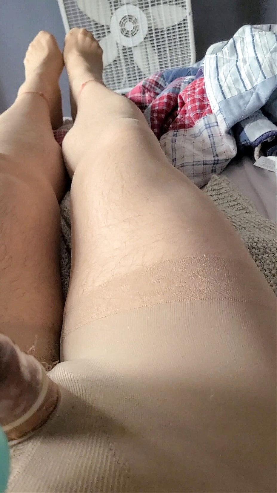Vibing small cock to orgasm in a condom and nylons. Foot fetish.
