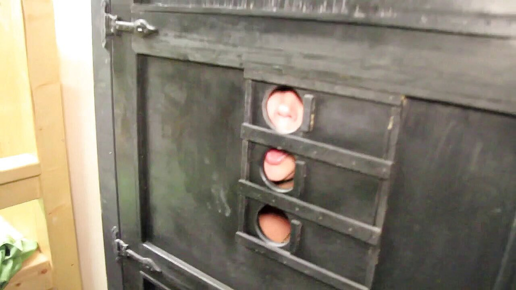 How do you start a gangbang party in a dungeon? Lock the slut into a glory hole and let her suck off the guys who are about to use her. That's how.