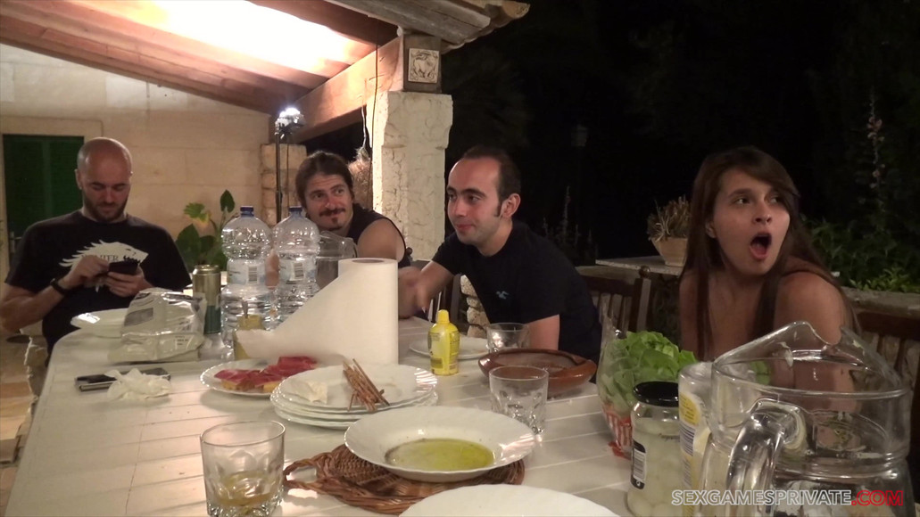 Group of horny and happy people are partying and fucking in tropical paradise, brunette babes choose dick for dinner instead of sausage