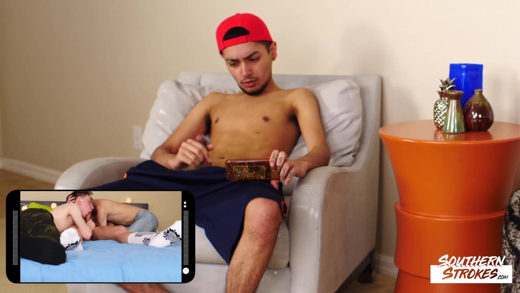 Adorable young Latino Diego Martin watches gay porn on his phone while tugging his dick up and down, preparing to cum blast solo!