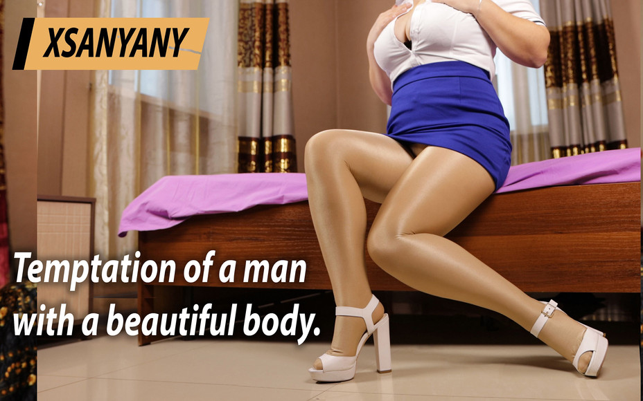 I'm wearing a white blouse, bra, blue skirt, and tight, shiny, flesh-colored tights. On my feet are white high heels. I pose for your gaze. My back arches, writhing. Sexy ass excites your gaze. My shiny legs catch your eyes. Your hard cock is ready to enter me. But this is only a temptation.