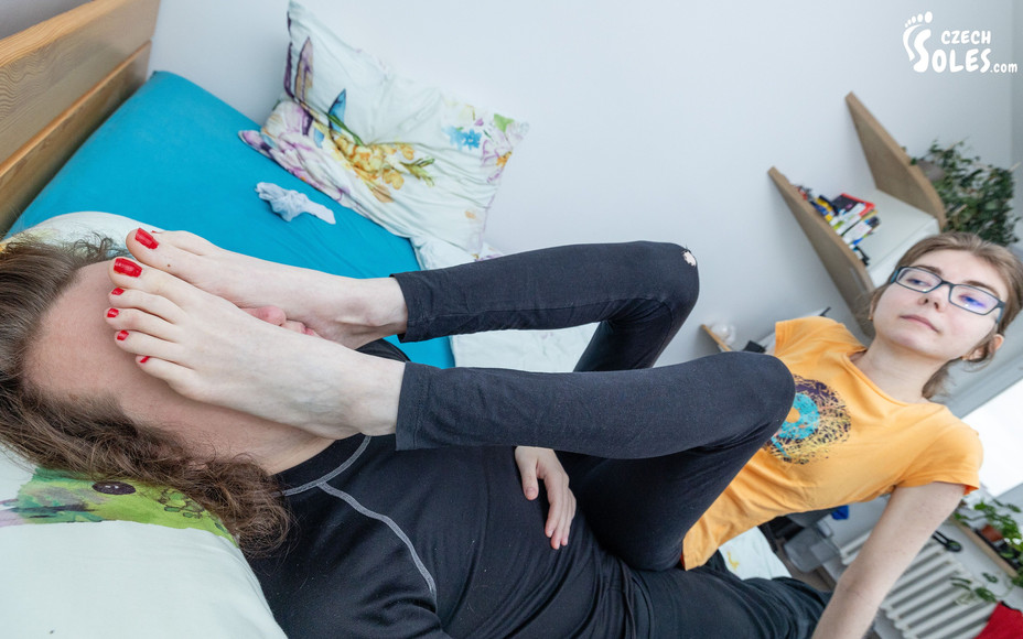It's the worst when girl's boyfriend is the laziest creature under the Sun. Even worse feeling is when your return from work only to find him in bed, so lazy looking that it hurts. She has to do something about this! This cannot continue indefinitely! One idea would be to use her stinky after-work feet and make him smell them. He hates smelly feet and it would be a fun for her too. Lets do it! She sits over him in the bed so he can't fight back and put her feet still in those gross worn stinky socks right on his face and starts to make him smell her feet. If he wants to breathe he has to smell those smelly socks and stinky feet. A right punishment for the laziest boyfriend ever. But that's not the end. He should enjoy those big feet and long toes right in his face too, barefoot. Those feet smell like crazy and he'll be so humiliated by this he will never be lazy again. And if he will be at least he'll know what's to come again!