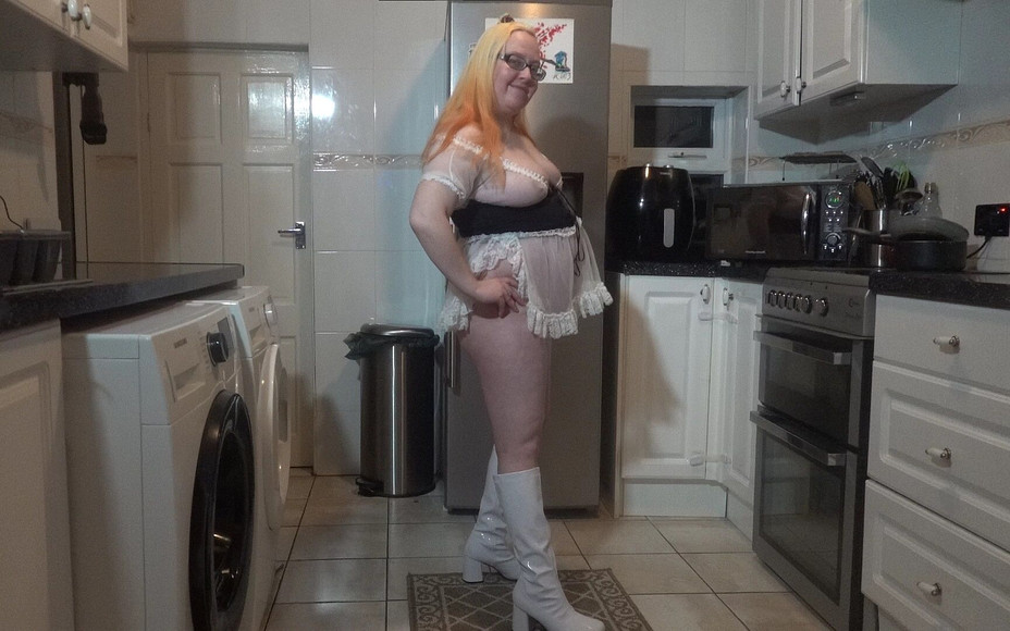 wearing my Naughty Wench in white knee boots