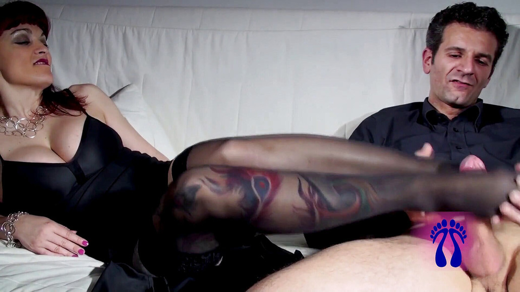Nadržená zrzavá milfka v černých punčochách se honí na vysokých podpatcích a čeká na masáž nohou a adoraci nohou. Zpocené nohy jsou tak připravené k footjob a hrát si s velkým ptákem až do výbušného orgasmu a výstřiku, sperma na punčocháče