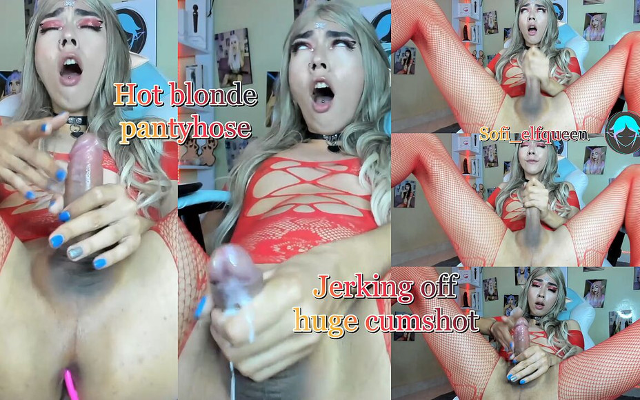 Sofi elf královna je sexy blondýnka v sexy oblečení s punčochami, zatímco masturbuje svůj velký penis a dělá lahodné a tvrdé sténání. Tato nezbedná blondýnka pokračuje v masturbaci svého ptáka a masírování jejích velkých koulí, dokud neudělá obrovský výstřik přes ruku a nejí všechno své vlastní sperma, lízání celé její ruky a plnění úst spermatem
