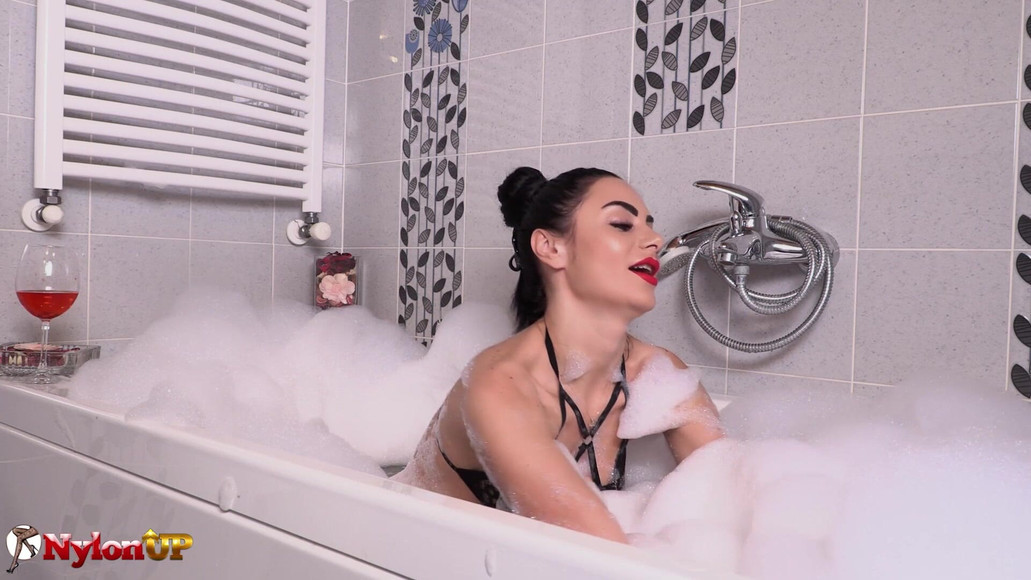 Sexy Goddess Ambra is lying in the bathtub, with nothing on but a black cut out bra and a pair of sheer black pantyhose. What closely as gorgeous Goddess Ambra has a bubble bath, sips juice from a crystal stem glass and places her wet nylon-clad feet on the edge of the tub, allowing you to get a good look at her wet soles. She finally stands up and runs her hands all over her wet nylon-covered butt, hips and legs.