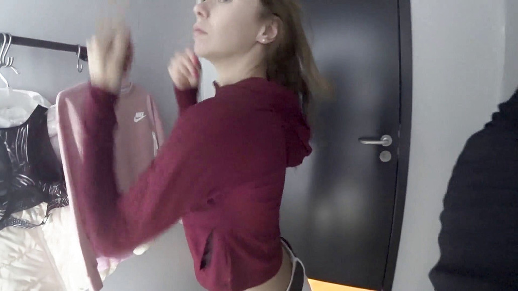 My boyfriend never gets bored when we go shopping, because I always take him with me to the fitting room. I wanted to give him a classic fitting room blowjob, but he got heated. He grabbed my hair and started to fuck my face. But that's not all. If you think your girlfriend is naughty for blowing you in the fitting room, she needs to step up her game. I let my boyfriend fuck my tight ass in there, with people walking all around us. It was a nice anal quickie and he ended up cumming all over my face and boobies. I don't like to waste delicious sperm, so I picked it all up with my fingers and put it in my mouth. When we got out of there, I still had a bit of cum at the corner of my mouth.