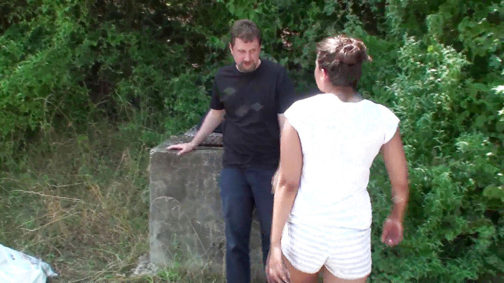 Princess Diavola kicks Joschi in the woods in the stomach. Joschi must be straight up and hold still. Then his young gypsy lady kicks hard again and again with the right foot and with the knee in the stomach.