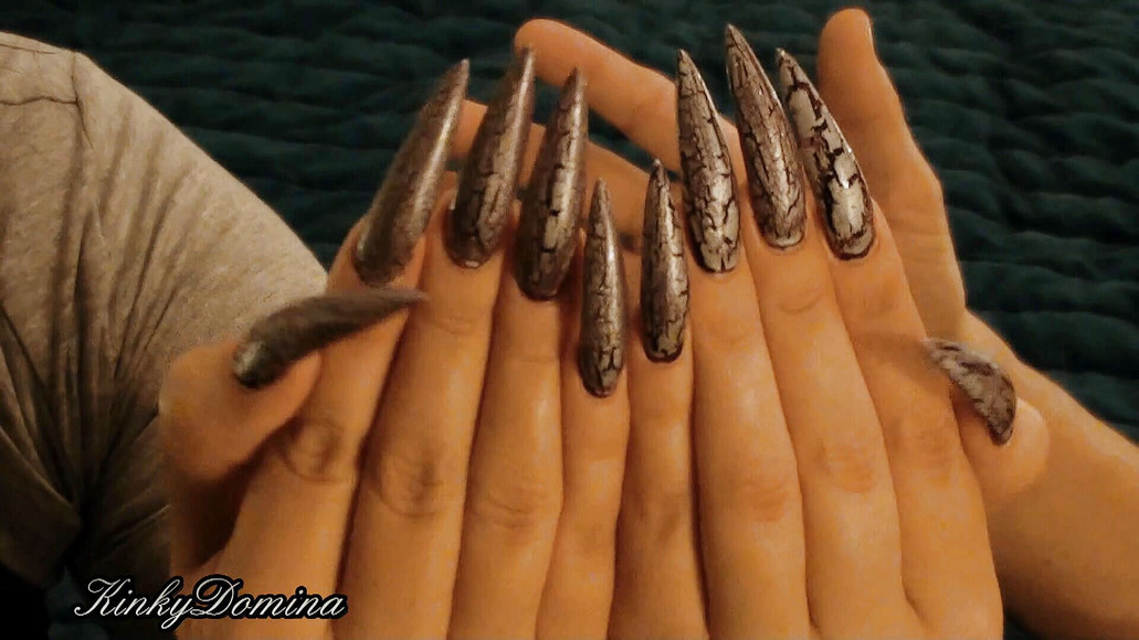 My nails have grown so long lately, so I thought it was time for a nails comparison video, comparing my hands with my sub’s hands. As you can see, the stiletto nails are sharp and curved, painted with black and white crackle nail polish. Would you feel intimidated by these dangerously sharp fingernails?