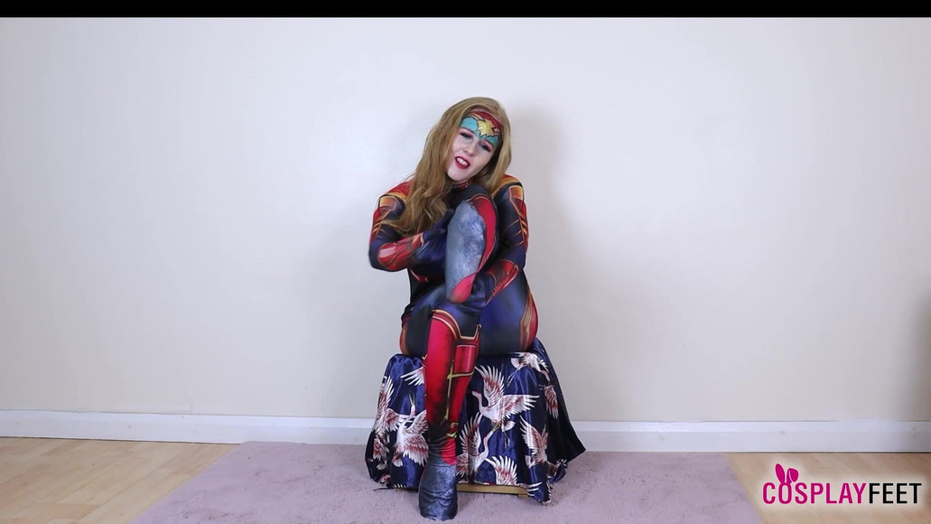 Stunningly beautiful Aurora Phoenix exudes sexiness and seductive vibes in a superhero costume. The smoking-hot babe looks sexier than ever as she flaunts her gorgeous body in a full Captain Marvel costume that complements her beautiful ginger locks and emphasizes her sensational curves. The stunning hottie seductively runs her hands on her long, shapely legs, puts her feet on a footstool, takes off her costume and lures you with her sexy feet. She then shows off her perfect butt in a tiny thong and takes off her bra.