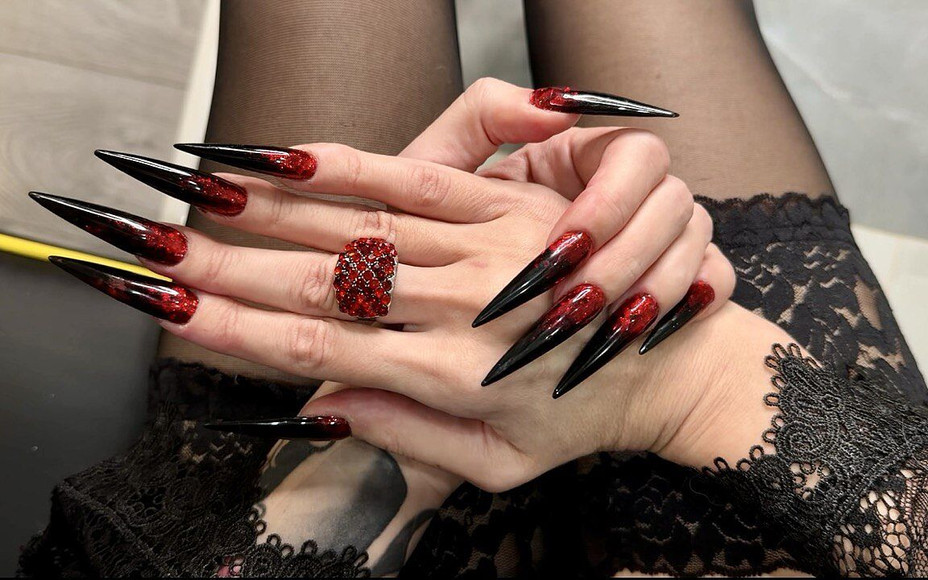 HOT black color long nails, sharp claws. Im tattooed skinny milf with black glasses on. Brunette long hair and red lipstick on lips. I'm wearing a black lace lingerie and black stockings. Palms spreading very wide and sucking fingers too. Claws. Showing my long nails, finger sucking, playing with hair and more. Big lips, face fetish and eye glasses fetish too. Glamour and arrogant women. Jewelry Fetish. Worship my long nails and cum all over long fingers