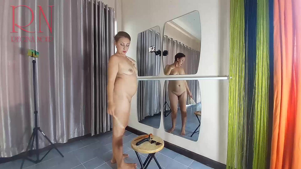 Naked nudist hairdresser. She cuts her own hair. Regina Noir